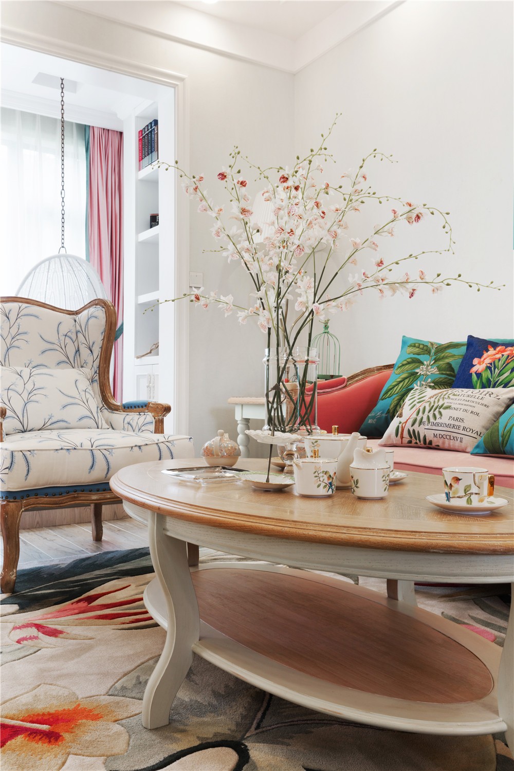 室內客廳裝修效果圖,整個客廳選擇了簡歐簡潔,選線條圓潤,色彩豐富,用了自然綠和深藍來緩沖粉色沙發的跳躍感。