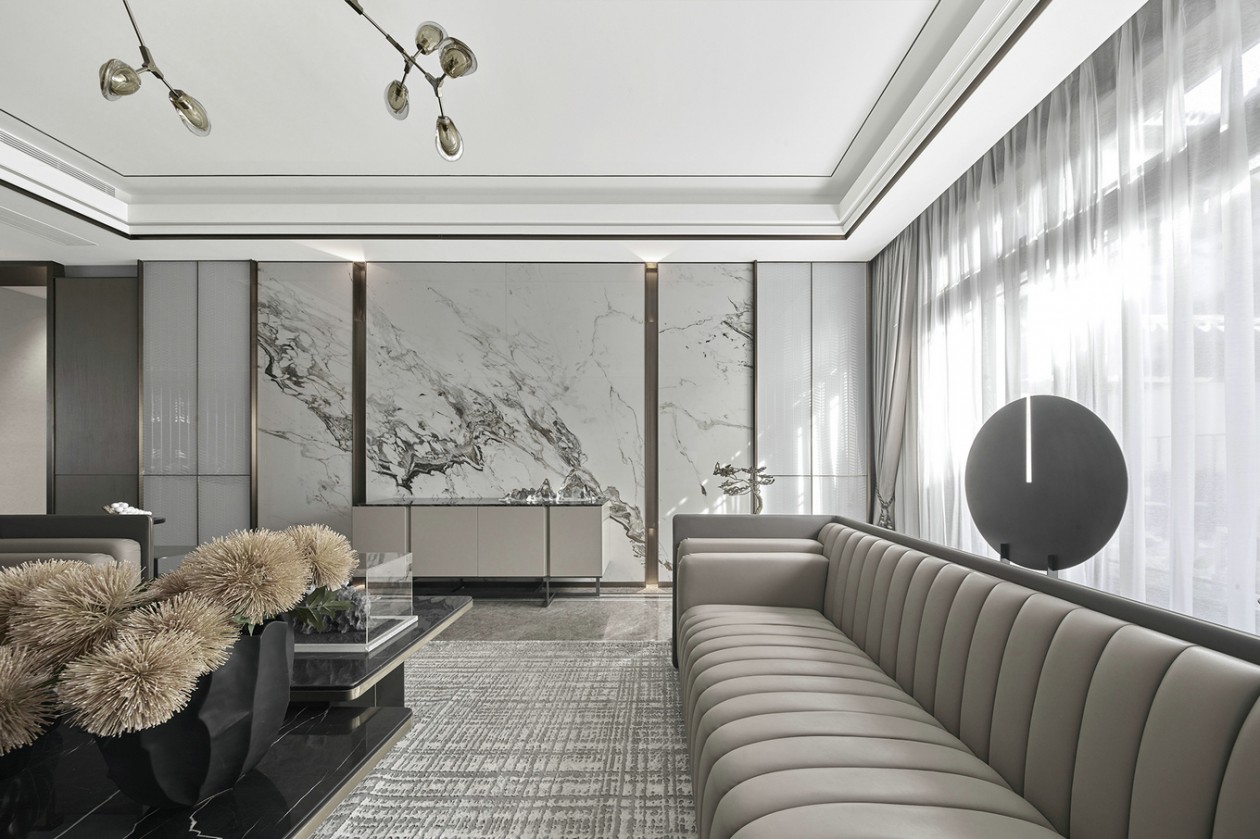 陽光透過輕紗,從庭院外灑滿整個客廳。質感細膩的大白花大理石將山色湖光的片刻靈動擲于墻上,搭配地面宛若水波般機理延綿的意大利灰大理石,以及氣質清傲的啞光質感染色銀檀木,一幅融合了現代皴法的寫意山水,在客廳悄然渲染而開。置身其間,悠然畫上,時而獨自清凈,時而天倫之樂。落地窗外,庭景依舊,四季螺旋更迭。