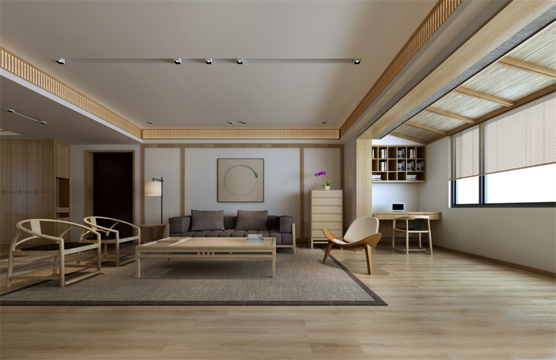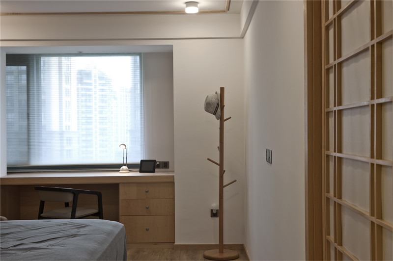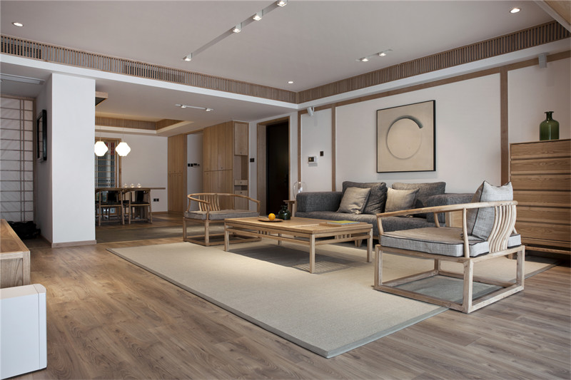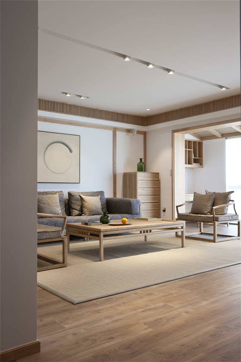 客廳灰色的棉麻布藝,米色的地墊和墻上不規則圓形的掛畫相呼應,完美演繹了和風,一種“有缺”的禪意。素色空間難免會顯得單調,巧妙地利用細節點綴能獲得很好的效果,如設計師在客廳放置的綠色玻璃瓶和綠植的融入能夠有效地增強空間活力。