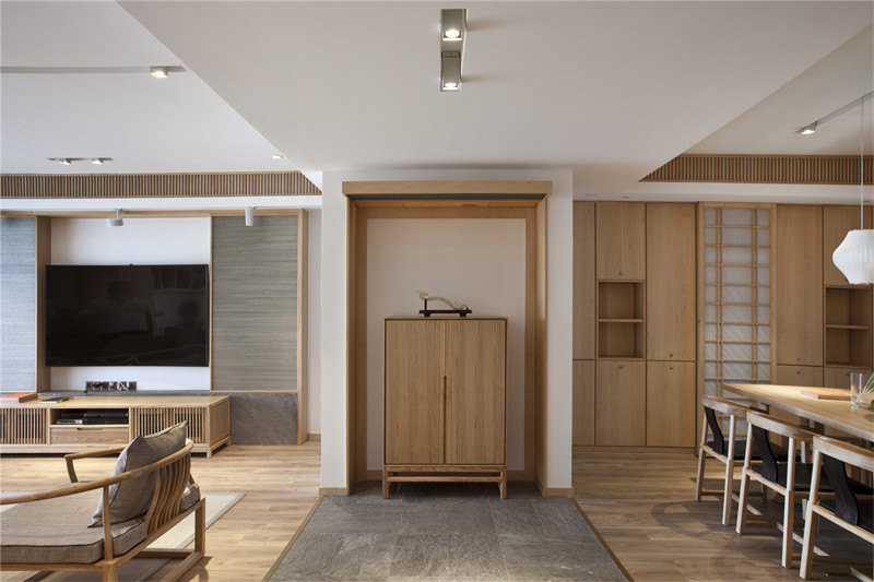 客廳電視墻的一側是茶室入口,進入茶室即可看見一整面的內嵌柜子,其中擺放著屋主的各種收藏。靜坐于此,煮上一壺茶,會一會老友,就著茶香木香,談天說地,這才是生活原本的模樣。