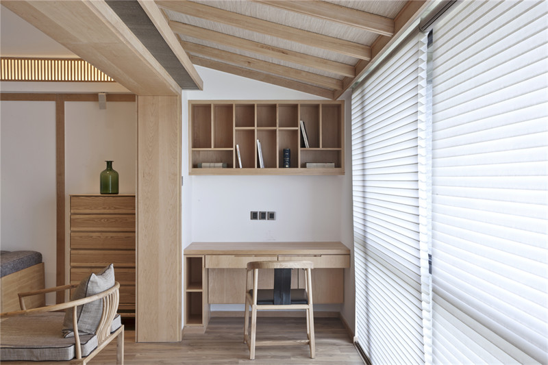 閑置的墻角位置活用為書房,內嵌式的設計進一步地節省空間,木質的書架和書桌簡單又實用,緊扣家居風格。