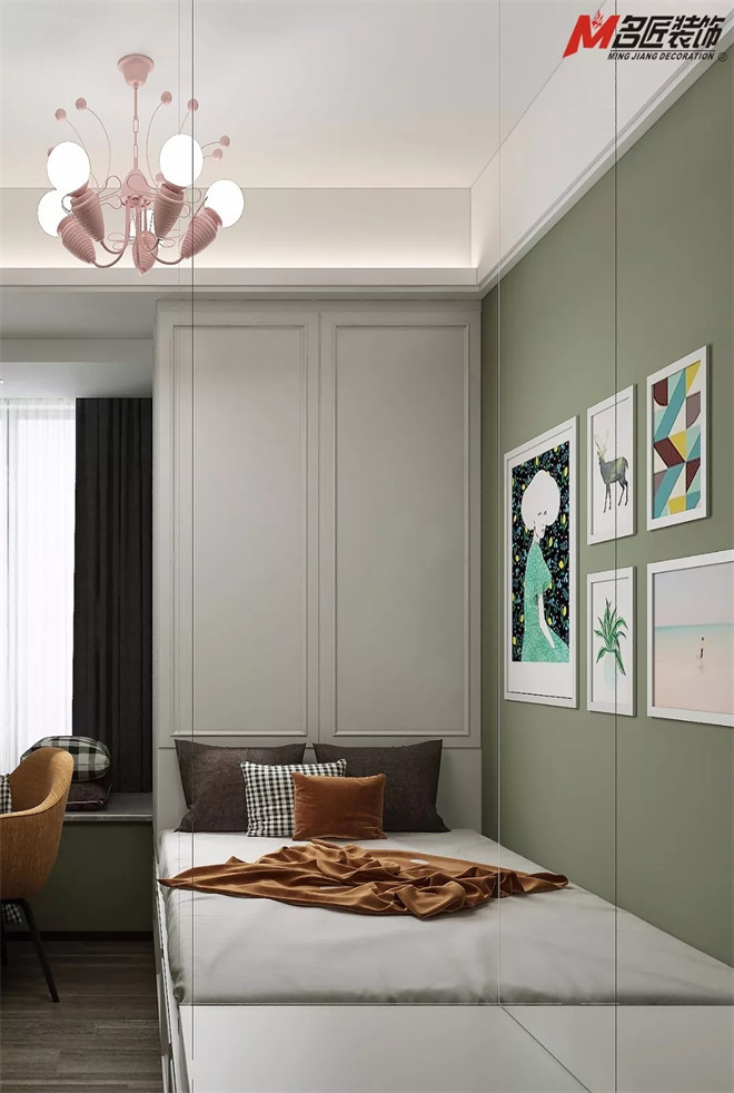 鶯色綠兒童房墻面,用上柔調(diào)的粉色燈具,以組合形式的裝飾畫(huà)為空間的視覺(jué)中心,色彩簡(jiǎn)單明快。簡(jiǎn)約線條造型書(shū)架,既可以裝飾也可歸置物件,不同飽和度不同明度的顏色與花紋相互交叉融合,活潑而不繁雜。