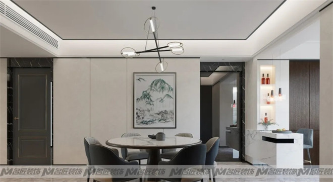 舒適圈的生活不能待太久,要走出來。設(shè)計(jì)更加如此,適當(dāng)?shù)臎_突有其存在意義。不破不立是沖突更是再平衡,這也是設(shè)計(jì)存在的意義。平衡之術(shù)運(yùn)用在每一個(gè)場(chǎng)景里,如同客廳里那一塊藝術(shù)背景墻,與茶幾上的盆栽遙遙相望,平衡左右。切割撕裂后又將其揉合平衡是趣味所在。