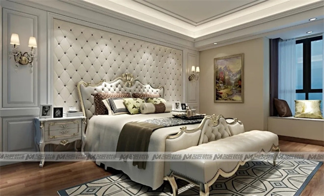 簡歐風格的主臥在高貴典雅的外表下,溫暖的情調在慢慢地散發開來。米白色的菱形軟包背景墻與床頭設計一致,起到裝飾作用的同時,