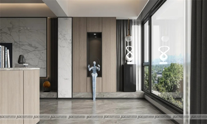 進(jìn)入玄關(guān),已然感受到彌漫在空間里的現(xiàn)代輕奢感,造型獨特的人物雕塑及藝術(shù)性擺件,使玄關(guān)的設(shè)計感更加充盈