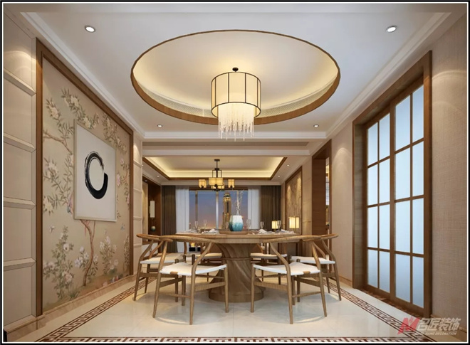 餐廳設計延續了“中國圓”的概念,圓桌設計與圓形吊頂相呼應,同時體現了空間的層次美與中國傳統文化的圓滿之意。