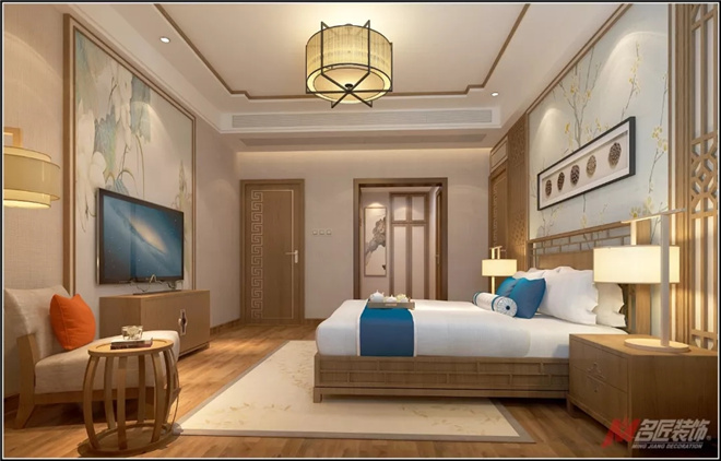 臥室設計講究清幽安靜,新中式的臥室更是講究,將東方韻味與人文內涵相互兼收,創造素雅寧靜的環境,來舒緩奔波于都市之間疲憊的身心。