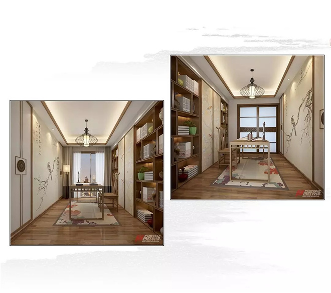 書房是除客廳以為最能體現主人氣質的地方,空間的設計遵循中式的對稱美學,中正的格局搭配貫穿本案的“鳥語花香”的壁畫紋樣,極力營造人與自然和諧的畫面感