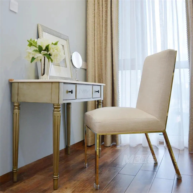 客廳布藝沙發混搭皮質沙發,淺藍色的基調用金色點綴,富麗的窗簾打造出優雅溫柔