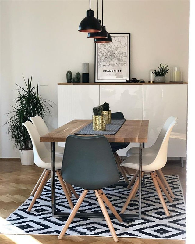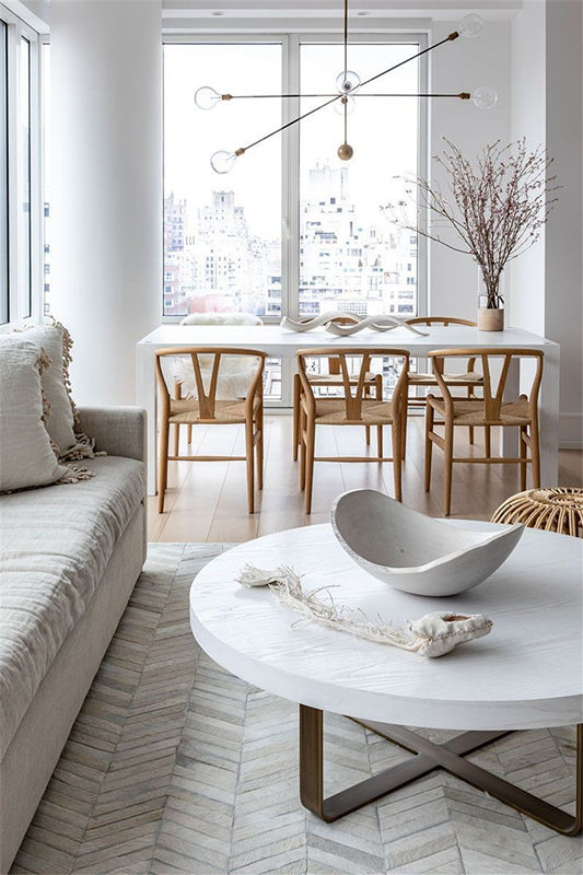 寬敞的客廳可以選擇地面分區(qū)的方法,瓷磚或地板使用不同的樣式、放置地毯等,都能讓餐廳與其他空間分隔開,且界限分明。